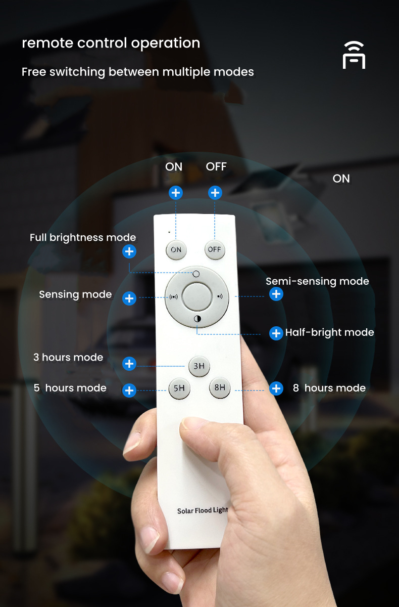 Working Mode 100% lighting+50% lighting+sensor mode+AI mode+3H lighting+5H lighting+8H lighting
